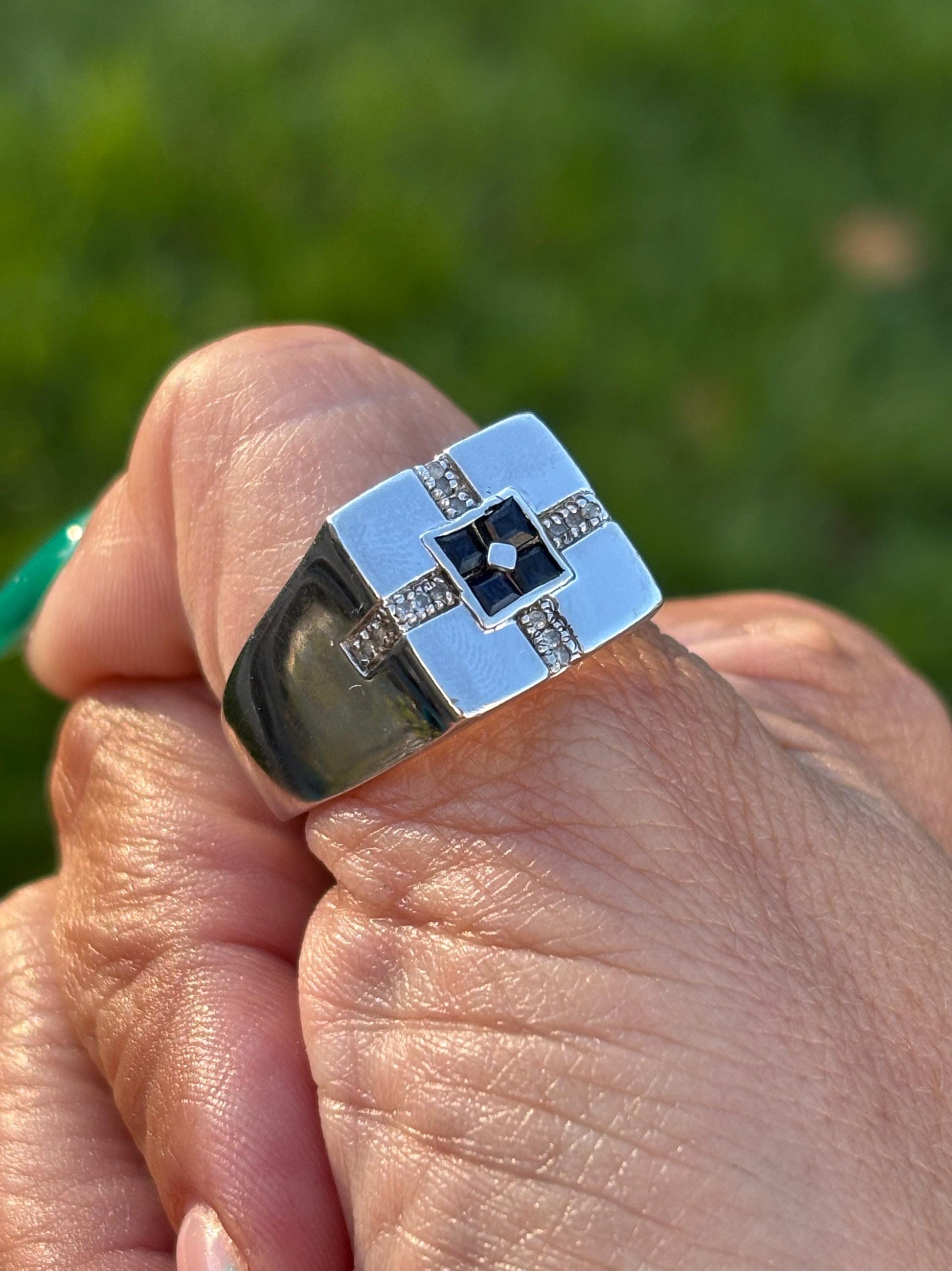 Sapphire and Diamond Ring: Sterling Silver Geometric Square, Size 13.5