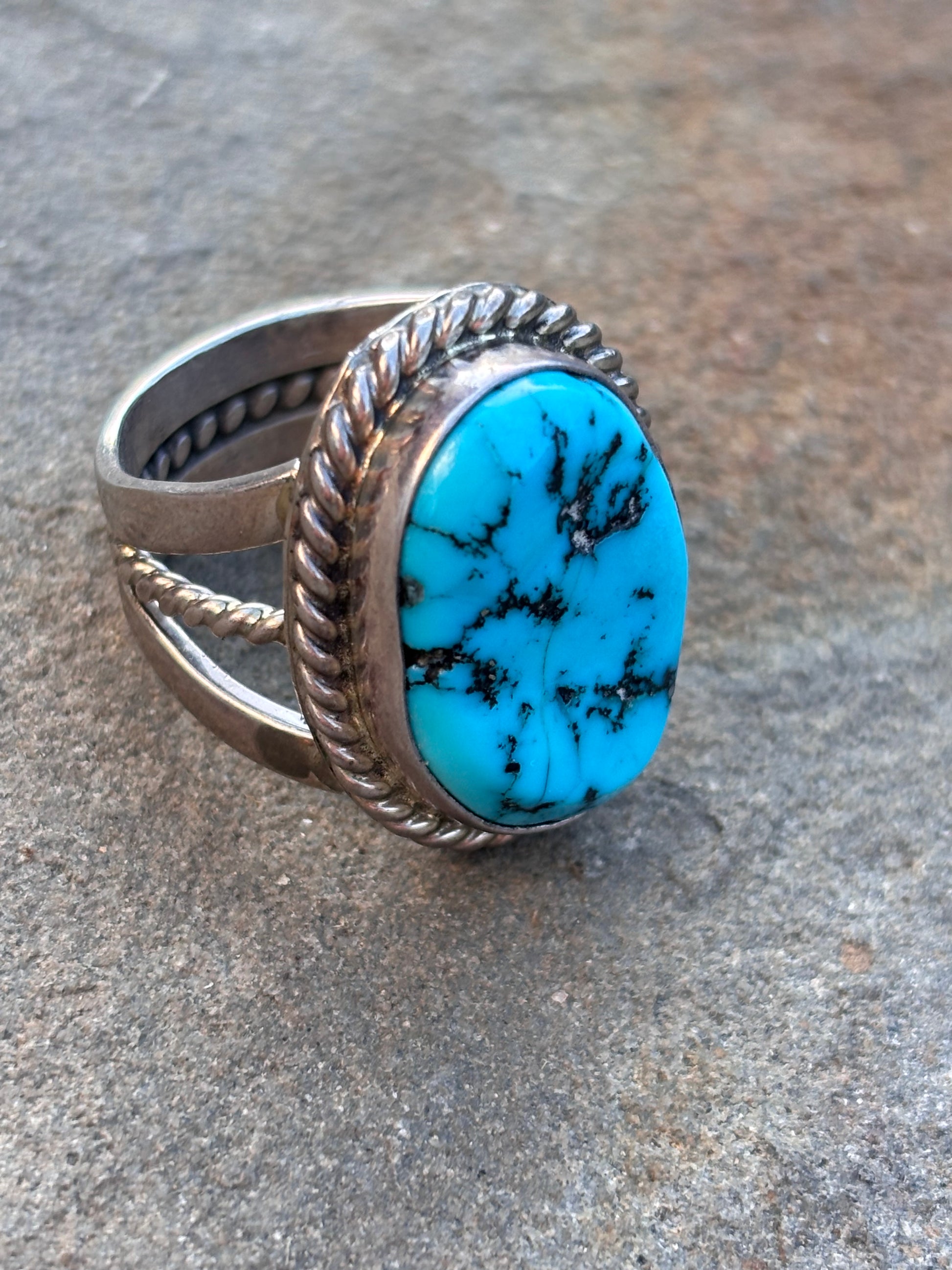 A striking vintage sterling silver turquoise ring featuring a vibrant blue stone with dark spiderweb matrix, framed in a traditional twisted-rope bezel. The split shank band gives it structure and comfort — bold yet easy to wear.